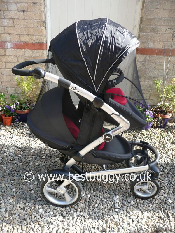 A single raincover is included as standard but the double raincover is an extra. The raincovers come in lovely small drawstring bags. I have to say I am not a fan of huge bulky raincovers (they take up so much space) so to have a raincover in a small useful bag is great. I discovered today that there is a really useful little ‘screw’ on the left hand side of the handle (I believe it is part of the folding lock) which is perfect to hang the raincover from, thus leaving valuable space in the storage basket. But to make things perfect I would love a bag that you could velcro onto the chassis or handle that is more in keeping with the sleek lines of the Kobi, like Phil & Teds do with their storm covers. I was even eyeing up the back axle earlier wondering if my Phil&Teds Base Bag would fit over the axle to keep the raincover in! But that’s me being having a wish list and I love the raincovers in their bags – its certainly a vast improvement on bulky raincovers that arrive in cheap plastic bags! Anyway I digress once again. The raincover comes tightly coiled – that in itself is a thing of beauty and I was compelled to photograph it! I worried that I wouldn’t be able to get the raincover back into the tiny bag again, but I did, although admittedly it took two attempts! The raincover fits perfectly. For something that folds so small I was very impressed. I tried the mosquito net too and that fits extremely snuggly. I liked the additional velcro flaps which hide the zip joint at the top, and should make extra sure no bugs get in through the fastenings.