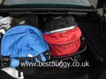 I think my main grumble with the Babystyle Oyster Max is the lack of storage for any shopping, changing bag – or even for the raincovers. I went to shopping and knew that there was no room really on board the Oyster Max for groceries. So I pimped the Oyster Max up with a strange combination of a Bagabottle bag (for my purse, camera etc), a Hamster Bag – but I realised that it was obstructing the view for my youngest child. So I added a J.L. Childress mesh bag to the other side so that my son had some view through the mesh. But none of it was ideal. At the till I realised the milk and bread wouldn’t fit into either bag. I managed to drop the milk into the basket, and then after a lot of huffing and puffing I got my arms in and around the chassis enough to lift the footrest up (two buttons one on either side) so that my son wouldn’t stand on the milk – or worse – throw it out on the way home. But when I got home, I couldn’t extract the milk without removing the lower seat. A zip access would have allowed this tiny amount of basket space to be useful – even just for heavy shopping or raincovers – there is little point in putting the raincovers underneath if the lower seat needs removing if a rainshower breaks.